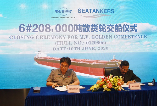 On June 10, 2020, the closing ceremony for 6# 208,000 DWT Bulk Carrier was held at the meeting room on 8th floor of New Times Office Building. Our CEO Mr.Liu Haijin, Executive General Manger Mr. Zhang Yuyong, the representive from SEATANKERS Mr. A.C. Caeiro, and the representative from LR Mr.Kim attended this ceremony. The vessel was smoothly and successfully delivered by us and accepted by SEATANKERS.