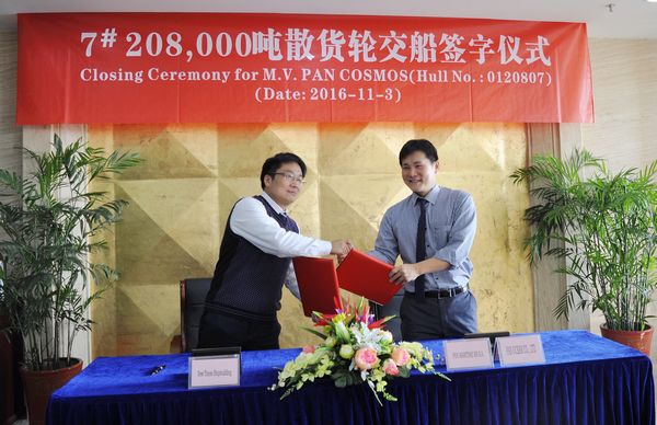 On Nov. 3rd, the delivery ceremony for No.7 208,000 DWT Bulk Carrier was held at the meeting room on 8th floor of New Times Office Building. The delivery documents for this ship were successfully signed by Executive Deputy General Manger Mr. Zhang Yuyong and representatives from the Contracted Buyer, Pan Ocean Co., Ltd.