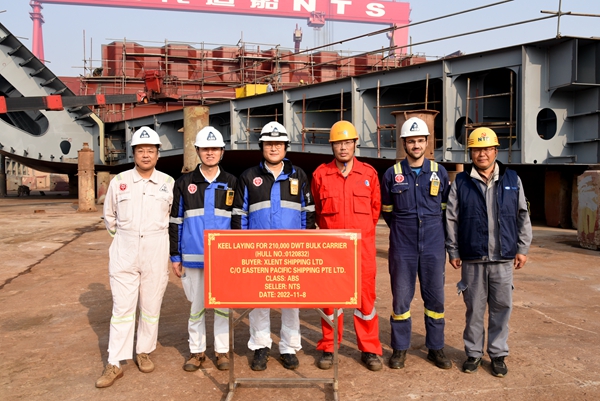 On November 8, 2022, the keel laying of one 210,000 DWT Bulk Carrier bearing builder's hull no. 0120832 has been carried out successfully by New Times Shipbuilding Co., Ltd.. Our Production Manager Mr. Chen Yuefeng, the representatives from EPS Site Manager Mr. Ni Jie and the representatives from ABS classification society attended and witnessed this event.