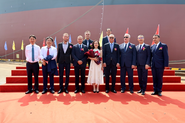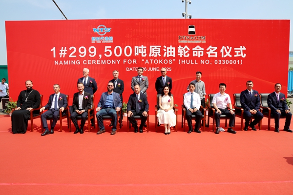 On 26 June, 2025, we held naming ceremony for one 299,500 DWT Crude Oil Tanker with Builder's Hull No.0330001. Our Executive Deputy General Manager Mr. Zhang Yuyong, General Manager Assistant Mr. Xu Zhenyu, Dynacom site manager Mr. Romeo Mustata, ABS  site manager Mr. Cao Wei and other VIP guests attended this ceremony.