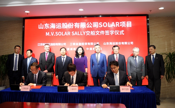 At 4:00 p.m., Our Executive Deputy General Manager Mr. Zhang Yuyong and Vice General Manager Mr. Xu Tao of Shandong Shipping Corporation signed the delivery documents, which indicates that the first of 8 X 50,000 DWT Product Oil/Chemical Tankers (IMO II Type) of the SOLAR project was completed and delivered.