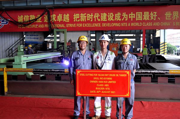 On August 20, 2021, the Steel Cutting of one 156,500 DWT Crude Oil Tanker bearing builder's hull no.0315856 has been carried out successfully by New Times Shipbuilding Co., Ltd.. Our Head of Production Department Mr. Chen Yuefeng and representatives from ABS classification society attended and witnessed this event.