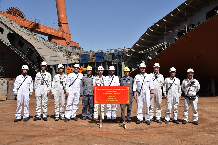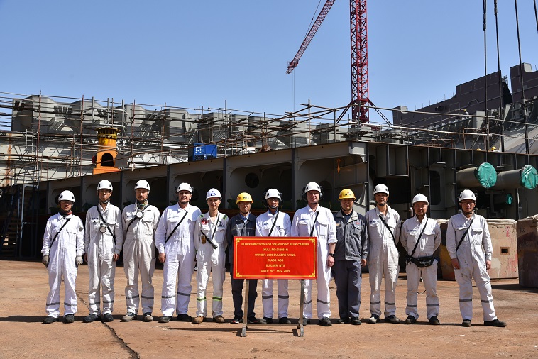 On May 20, 2019, the block erection ceremony of No.13 & No.14 208,000 DWT Bulk Carriers was held in Drydock No.3. Our General Manager Assistant Mr. Ding Baiying and representatives from the owner 2020 Bulkers and ABS classification society attended this event.