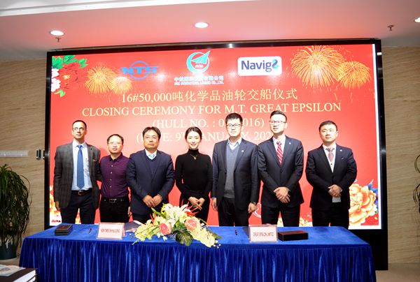 On January 9th, 2020, we held naming ceremony for one unit of 50,000 DWT Product Oil/ Chemical Tanker with Hull No.0305016 that was built for AVIC and charterered to Navig8. Our CEO Mr.Liu Haijin, Board Director Mr. Yuan Heng, Executive General Manger Mr. Zhang Yuyong, Deputy general manager: Mr.Zhu hangang, Assistant General Manager Mr. Xu Zhenyu, and guests from AVIC: God mother Mrs. Cheng Lin, Director of Risk Control Mr. Wang Minghao, General Manager of Leasing Department Mr.Yang Guangyi , Navig8 site team manager Mr.Binod Kumar and KR China Regional Manager Mr.Kang Ho-seong etc., were present at this ceremony.