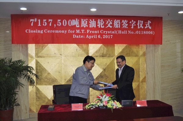 On April 6, the closing ceremony for No.7 157,500 Crude Oil Tanker was held at the meeting room on 8th floor of New Times Office Building.Our CEO Mr. Liu Haijin, Executive General Manger Mr. Zhang Yuyong and representatives from Owner Frontline attended this ceremony. The delivery documents for this ship were successfully signed by both parties.