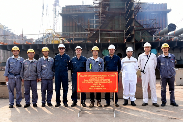 On October 10, 2024, the keel laying of one 113,500 DWT Crude/Product Oil Tanker bearing builder's hull no.0311550 has been carried out successfully by New Times Shipbuilding Co., Ltd. The representatives from Dynacom Site Office, BV classification society and shipyard attended and witnessed the ceremony together.