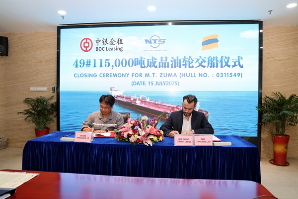 On 15 July, 2025, the closing ceremony was held at the meeting room on 8th floor of New Times Office Building. Our Executive Deputy General Manager Mr. Zhang Yuyong,  the representative from TMS Tankers Ltd Mr. Evangelos Pelekanos signed the delivery documents. The vessel was smoothly and successfully delivered by us and accepted by the Owner.