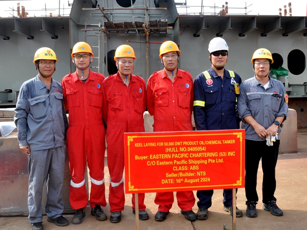 On August 16, 2024, the keel laying of one 50,000 DWT Chemical/Product Oil Tanker bearing builder's hull no.0405054 has been carried out successfully by New Times Shipbuilding Co., Ltd. The representatives from EPS Site Office, ABS classification society and shipyard attended and witnessed the ceremony together.