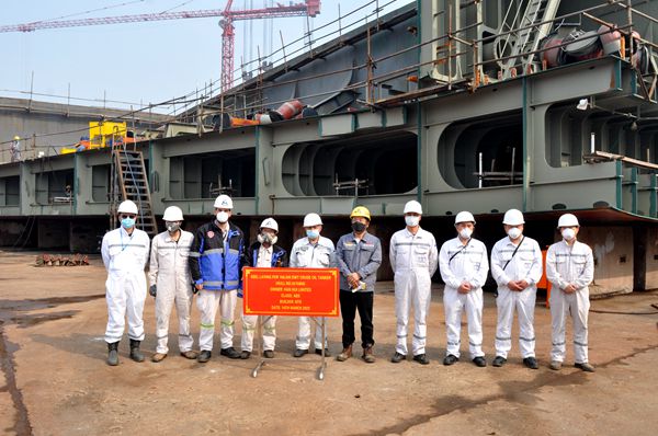 9:28,常務(wù)副總經(jīng)理張玉永與希臘船東Seaworld公司代表出席船舶進(jìn)塢合攏搭載儀式,希臘船東Seaworld公司訂制第2艘56#156500噸油船進(jìn)塢合攏,該船總長(zhǎng)274.3米,型寬48米,型深23.2米,設(shè)計(jì)吃水16米,結(jié)構(gòu)吃水17.15米,載重156500噸,入ABS船級(jí)社。