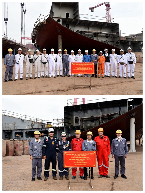 新區(qū)船塢內(nèi),首制8100箱集裝箱船、7#7000箱集裝箱船的進(jìn)塢合攏儀式分別舉行,常務(wù)副總經(jīng)理張玉永分別與船東CONGLOMERATE MARITIME LIMITED代表、船東EPS公司代表及公司相關(guān)部門(mén)負(fù)責(zé)人出席活動(dòng)。船東CONGLOMERATE MARITIME LIMITED在我們企業(yè)訂制了10艘8100箱、10艘11400箱雙燃料動(dòng)力集裝箱船,此次開(kāi)工的是8100箱集裝箱船中的首制船,該型船總長(zhǎng)260米,型寬45.6米,型深24.7米,設(shè)計(jì)吃水12.5米,結(jié)構(gòu)吃水15.5米,空高62.5米,結(jié)構(gòu)吃水下的載重噸97,500MT。船東EPS公司在我們企業(yè)共訂購(gòu)了7艘7000箱集裝箱船,此次開(kāi)工建造的是該系列船中最后一艘船舶,該型船總長(zhǎng)272.5米,型寬42.8米,型深24.6米,設(shè)計(jì)吃水13米,結(jié)構(gòu)吃水15米,載重噸為84,000MT。這兩艘船舶均于2023年11月24日開(kāi)工建造。