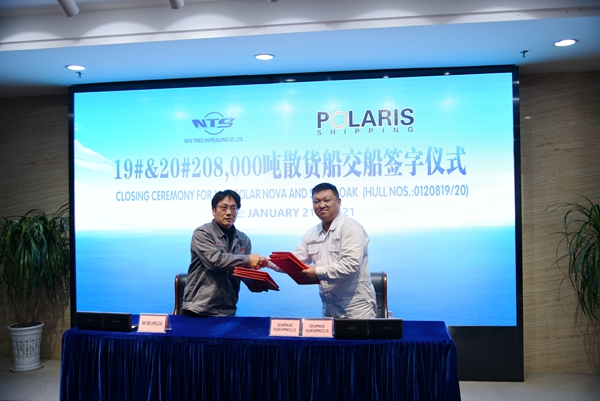 1月21日上午,公司在八樓會議室舉行船舶簽字交付儀式,總經理劉海金、常務副總經理張玉永、韓國船東POLARIS SHIPPING CO.,LTD.(北極星公司)代表Han Mingoo先生共同出席活動。在大家的見證下,張玉永與Han Mingoo先生共同簽署兩艘船舶交船文本,19#、20# 208000噸散貨船正式交付。