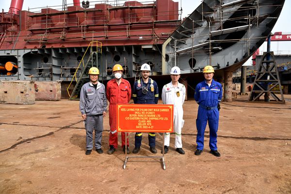 上午9:00,公司新區(qū)船塢區(qū)域內(nèi)迎來27#210000噸散貨船、34#156500噸油船船體進塢合攏儀式。生產(chǎn)管理部、營銷部、質量部等部門負責人與船東新加坡公司Eastern Pacific Shipping Pte. Ltd.(EPS)、船東新加坡船東Singfar國際公司代表分別見證兩艘船舶合攏搭載。