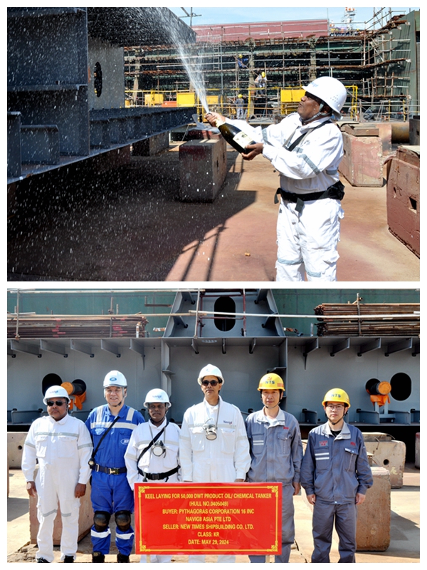 5月29日上午,公司在1#塢區(qū)域內(nèi)舉行船舶進塢合攏儀式,49#50000噸Ⅱ類化學品船、44#115000噸油船船體分段結(jié)構(gòu)開始合攏搭載。