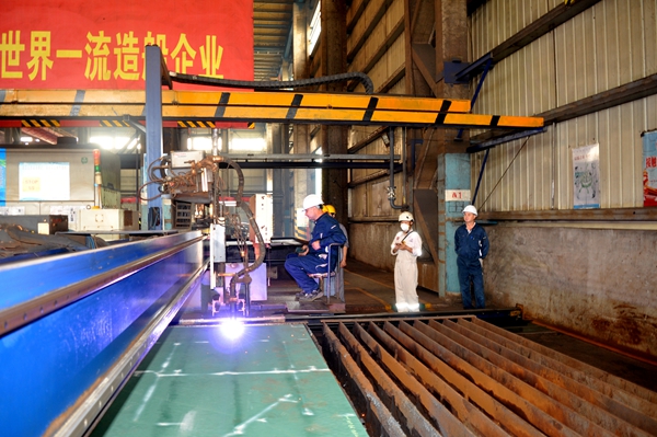 9月10日上午,1#295000噸油船開(kāi)工點(diǎn)火儀式在東區(qū)鋼加車(chē)間舉行,總經(jīng)理助理徐震宇與希臘船東Dynacom代表等出席活動(dòng),共同啟動(dòng)等離子切割機(jī)點(diǎn)火按鈕,船體結(jié)構(gòu)件開(kāi)始預(yù)制。