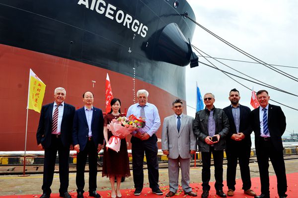 上午10:00,總經(jīng)理劉海金、常務(wù)副總張玉永、圣母嚴(yán)玲女士和希臘船東Chartworld公司代表Jagor Kalinic等嘉賓共同出席31#115000噸油船命名儀式,圣母嚴(yán)玲女士將該船命名為“AIGORGIS”號(hào),擲香檳、揭船名紅幕,祝愿新船前程似程,一帆風(fēng)順。命名儀式結(jié)束后,嘉賓們一起登上新船參觀,對(duì)新建成的船舶稱贊不己。