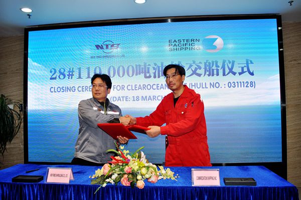 3月18日上午,公司舉行28#110000噸雙燃料動力成品油船交付儀式,總經(jīng)理劉海金、常務(wù)副總經(jīng)理張玉永與船東新加坡東太平洋航運(yùn)公司(EPS)代表倪杰出席儀式。