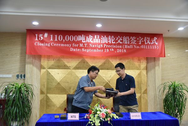 9月19日下午,公司常務(wù)副總張玉永與船東Navig8公司代表共同簽署交船文本,15#110000噸油船正式交付船東。