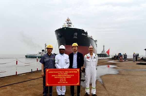 6月15日清晨,公司1# 塢區(qū)域內,4#5#50000噸化學品/油船靜靜地漂浮在船塢內,等待著下水工作開始。總經理劉海金、常務副總經理張玉永與船東沙特BIHAR INTERNATIONAL COMPANY的代表、ABS船級社代表等嘉賓也早早地來到生產現場,觀看船舶下水過程。