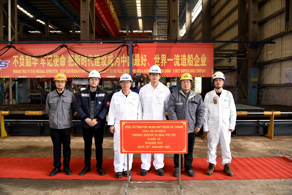 1月25日上午,公司在鋼加車間舉行船舶開工點(diǎn)火儀式,33#、52# 156500噸油船分別點(diǎn)火,正式開工建造。常務(wù)副總經(jīng)理張玉永、副總經(jīng)理朱韓鋼與新加坡船東Sentek Global Pte LTD.、希臘船東Avin International LTD.代表出席活動(dòng),見證船舶船體鋼板切割下料。