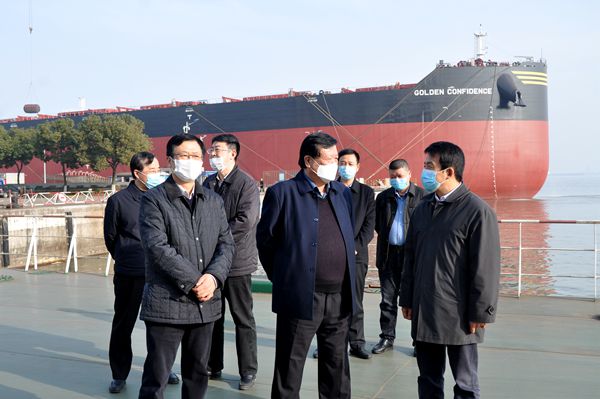 在公司,史立軍一行按照防控要求,通過(guò)企業(yè)測(cè)溫通道進(jìn)入生產(chǎn)廠區(qū)。走進(jìn)廠區(qū),只見(jiàn)鋼花飛濺,生產(chǎn)繁忙,巨型船塢里并排橫臥兩艘20萬(wàn)噸級(jí)船舶,江岸邊兩艘20萬(wàn)噸級(jí)船舶即將交付。“昨天我們剛剛交付了一艘32萬(wàn)噸級(jí)的輪船,今年可望完成400萬(wàn)載重噸的船舶訂單!惫径麻L(zhǎng)袁凱飛介紹說(shuō)。史立軍對(duì)此表示贊賞,勉勵(lì)企業(yè)在確保防疫安全、生產(chǎn)安全的基礎(chǔ)上,有序釋放造船產(chǎn)能,勇?tīng)?zhēng)全球市場(chǎng)份額,更好地彰顯泰州造船的硬核力量。史立軍強(qiáng)調(diào),要深入貫徹落實(shí)習(xí)近平總書(shū)記關(guān)于統(tǒng)籌做好疫情防控和經(jīng)濟(jì)社會(huì)發(fā)展系列重要講話精神,按照省委省政府決策部署,堅(jiān)定信心、凝心聚力、奮發(fā)作為,更大力度推動(dòng)企業(yè)高質(zhì)量發(fā)展,確保完成全年經(jīng)濟(jì)發(fā)展目標(biāo)任務(wù)。