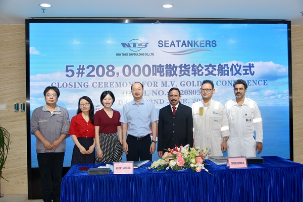 6月22日上午,公司在辦公樓八樓會議室舉行5#208000噸散貨船交船簽字儀式,總經理劉海金、常務副總經理張玉永和船東SEATANKERS公司代表A.C.Caeiro先生等嘉賓一起出席活動。儀式上,常務副總經理張玉永與船東SEATANKERS公司代表A.C.Caeiro先生共同簽署交船文本,5#208000噸散貨船正式交付船東。