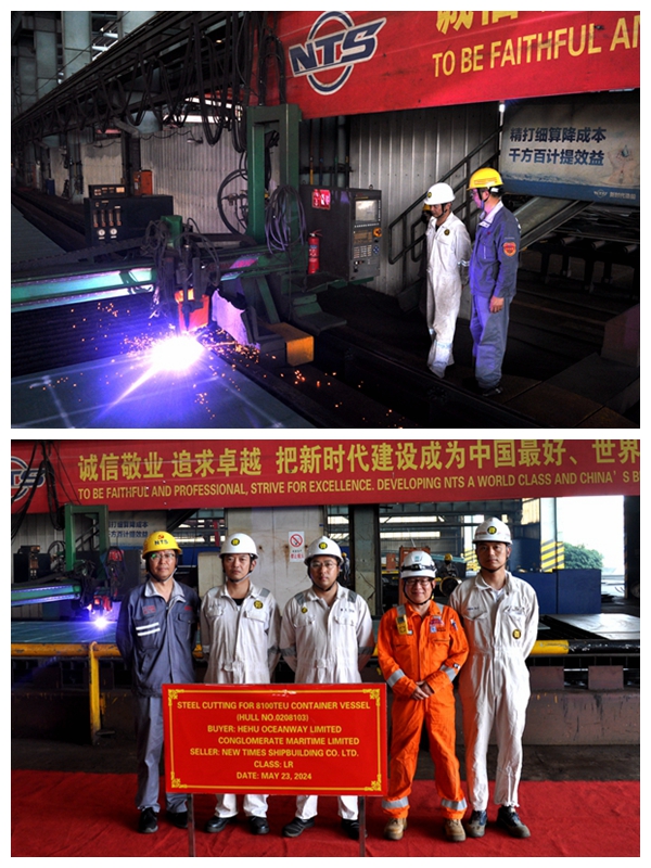 5月23日上午,公司在新區(qū)鋼加車(chē)間三跨舉行船舶點(diǎn)火開(kāi)工儀式,3#9#8100箱雙燃料動(dòng)力集裝箱船船體結(jié)構(gòu)件開(kāi)始預(yù)制,生產(chǎn)管理部、質(zhì)量部、營(yíng)銷(xiāo)部等相關(guān)部門(mén)負(fù)責(zé)人與船東CONGLOMERATE MARITIME LIMITED、LR&BV船級(jí)社代表參加活動(dòng)。