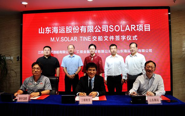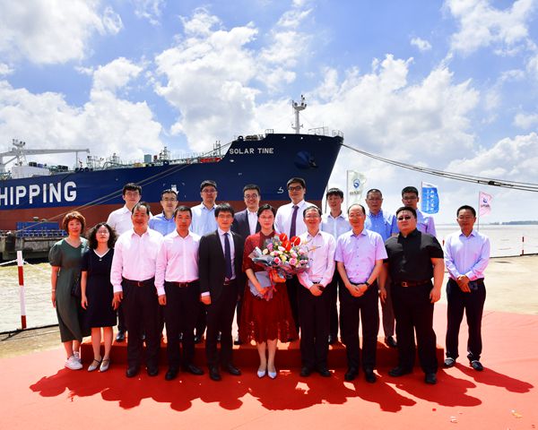 上午9:58分,常務(wù)副總經(jīng)理張玉永與山東海運(yùn)副總理徐濤及工銀租賃代表等一起共同簽署了交船文本;簽字結(jié)束后,總經(jīng)理劉海金與山東海運(yùn)副總經(jīng)理徐濤、圣母陳佳兒等嘉賓一起來到西區(qū)船舶碼頭,參加船舶命名儀式。在圣母的祝福祈愿聲中,23#50000噸化學(xué)品油船被命名為“SOLAR TINE”號(hào)。儀式結(jié)束后,總經(jīng)理劉海金又與參加活動(dòng)的嘉賓們一起參觀了新船。