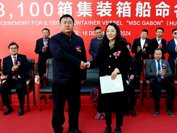 常務(wù)副總經(jīng)理張玉永主持儀式,教母徐嬌將7#8100箱雙燃料動(dòng)力集裝箱船命名為“MSC GABON”號(hào),并祝愿其在今后的航行中乘風(fēng)破浪、永遠(yuǎn)平安,為船東帶來源源不斷的財(cái)富。