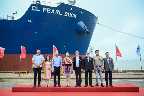 在喜慶的氣氛中,31#50000噸Ⅱ類化學品船被命名為“CL PEARL BUCK”號。儀式上,常務副總經理張玉永、山東海運油輪運輸有限公司董事長徐濤先后致辭,共同表達對在船舶建造過程中辛勤付出的全體人員表示衷心地感謝和崇高的敬意;31#50000噸Ⅱ類化學品船的建成,進一步夯實了各方的合作關系,該船的成功遠航,承載著合作各方的祝愿與期盼,預示今后美好航程的開啟。