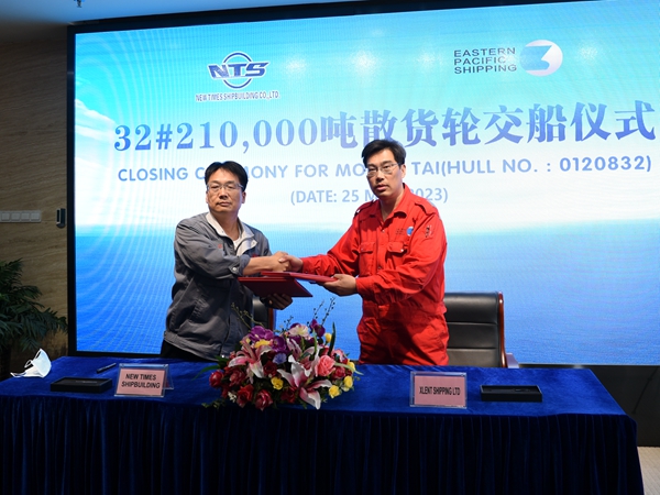 5月25日上午,公司在辦公樓八樓會議室舉行船舶交付簽字儀式,32#210000噸雙燃料動力散貨船成功交付船東Eastern Pacific Shipping Pte. Ltd.(EPS)公司運營。