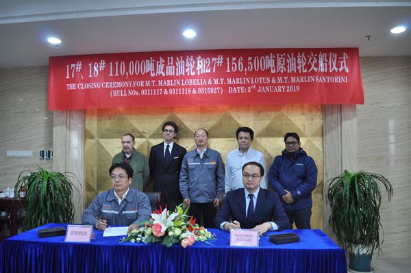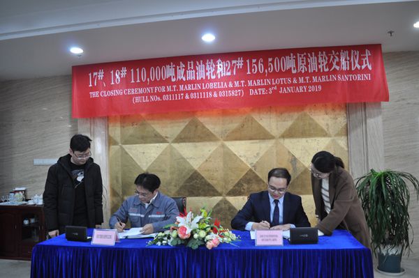 1月3日下午,公司在八樓會(huì)議室舉行船舶交付簽字儀式,總經(jīng)理劉海金、常務(wù)副總經(jīng)理張玉永與船東代表、船級(jí)社代表等嘉賓一起出席儀式。在大家的共同見證下,常務(wù)副總經(jīng)理張玉永與船東代表分別在交船文本上簽字,三艘船舶正式交付,迎來了新年的交船“開門紅”。此次交付的船舶分別是17#18#110000噸成品油輪和27#156500噸原油輪。