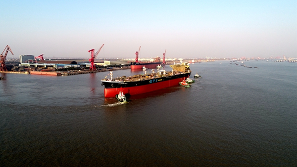 26#110000噸油船總長249.9米,兩柱間長245.2米,型寬44米,型深21.3米,設(shè)計(jì)吃水13.5米,結(jié)構(gòu)吃水15米,載重噸110200噸。船東公司Eastern Pacific Shipping Pte. Ltd.(EPS)在我們企業(yè)訂有4艘110000噸油輪和3艘210000噸散貨輪,此次下水的是110000噸油輪系列船中的第二艘。