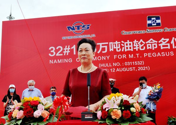 圣母陳秀芬女士在命名時(shí)表示:很榮幸有機(jī)會(huì)擔(dān)任希臘船東海圖世界與江蘇新時(shí)代造船合作的美麗船舶——32#115000噸油船的教母,為其命名并永遠(yuǎn)祝福她。這艘船舶是船廠與船東智慧的結(jié)晶,也是各方共同努力的成果。在此,首先感謝為這艘船舶建造作出努力的所有人員,特別是船廠的勞動(dòng)者,是大家的辛勤汗水鑄就了今天的榮耀,F(xiàn)在,32#115000噸油船將滿載希望開(kāi)始她的第一次旅程,我相信她一定會(huì)成功地完成使命,希望她遍訪三洋五洲,成為促進(jìn)繁榮的使者。最后,圣母陳秀芬女士將32#115000噸油船命名為“PEGASUS STAR”號(hào),并祝愿她和伴她遠(yuǎn)航的人們一帆風(fēng)順,平安如意!