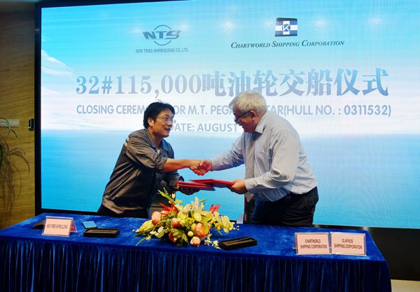 下午2:00,公司又在辦公樓八樓會(huì)議室舉行了32#115000噸油船交付簽字儀式,常務(wù)副總經(jīng)理張玉永與希臘船東Chartworld公司現(xiàn)場(chǎng)經(jīng)理Jagor Kalinic先生共同簽署交船文本,32#115000噸油船正式交付船東運(yùn)營(yíng)。此次交付的船舶是希臘船東Chartworld公司訂制的4艘115000噸油船系列船中的第二艘。該型油船船長(zhǎng)249.9米,型寬44米,型深21.5米,設(shè)計(jì)吃水13.6米,結(jié)構(gòu)吃水15.2米,艙容130000立方米,載重量為115000噸。