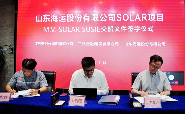 上午10:18分,常務(wù)副總經(jīng)理張玉永與山東海運(yùn)副總理徐濤及工銀租賃代表等一起共同簽署了交船文本;10:56分,總經(jīng)理劉海金與山東海運(yùn)副總經(jīng)理徐濤等嘉賓一起來到西區(qū)船舶碼頭,參加船舶命名儀式。在圣母的祝福祈愿聲中,22#50000噸化學(xué)品油船被命名為“SOLAR SUSIE”號。儀式結(jié)束后,總經(jīng)理劉海金又與參加活動的嘉賓們一起參觀了新船。