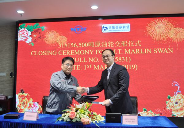 3月1日上午,公司新建的31#156500噸原油船簽字交付儀式在八樓會議室舉行,常務(wù)副總張玉永代表公司與船東代表簽署交船文本,該船正式交付。