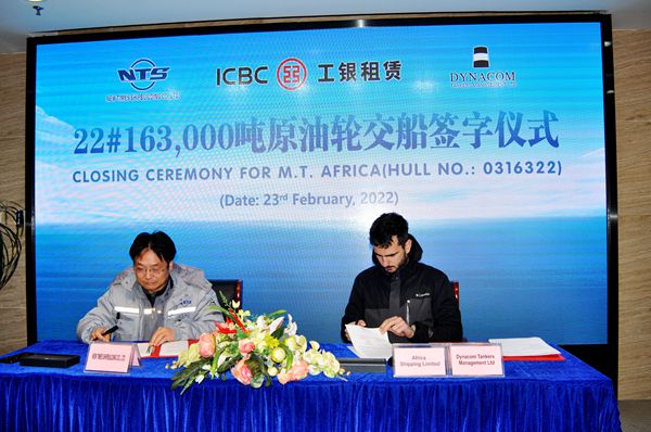 2月23日上午,公司舉行船舶簽字交付儀式,總經(jīng)理劉海金、常務(wù)副總經(jīng)理張玉永與希臘船東達能孔公司代表一起出席活動。張玉永與希臘船東達能孔公司代表共同簽署交付文本,22#163000噸油船交付船東運營。